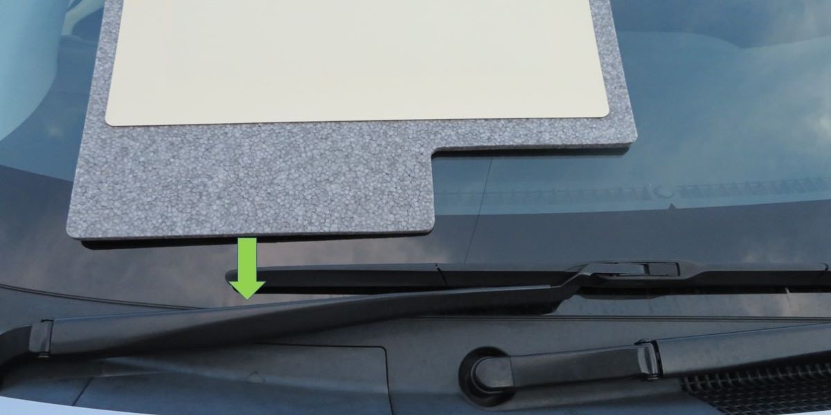①1枚のシートを開き、下記図のようにクッション部分をワイパーとワイパーアームの間に差込みます。