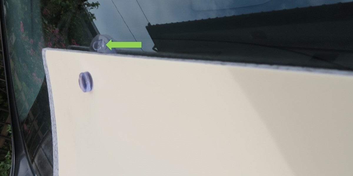 ②クッション部分を固定したら、下図の矢印の吸盤をフロントガラスに固定します。