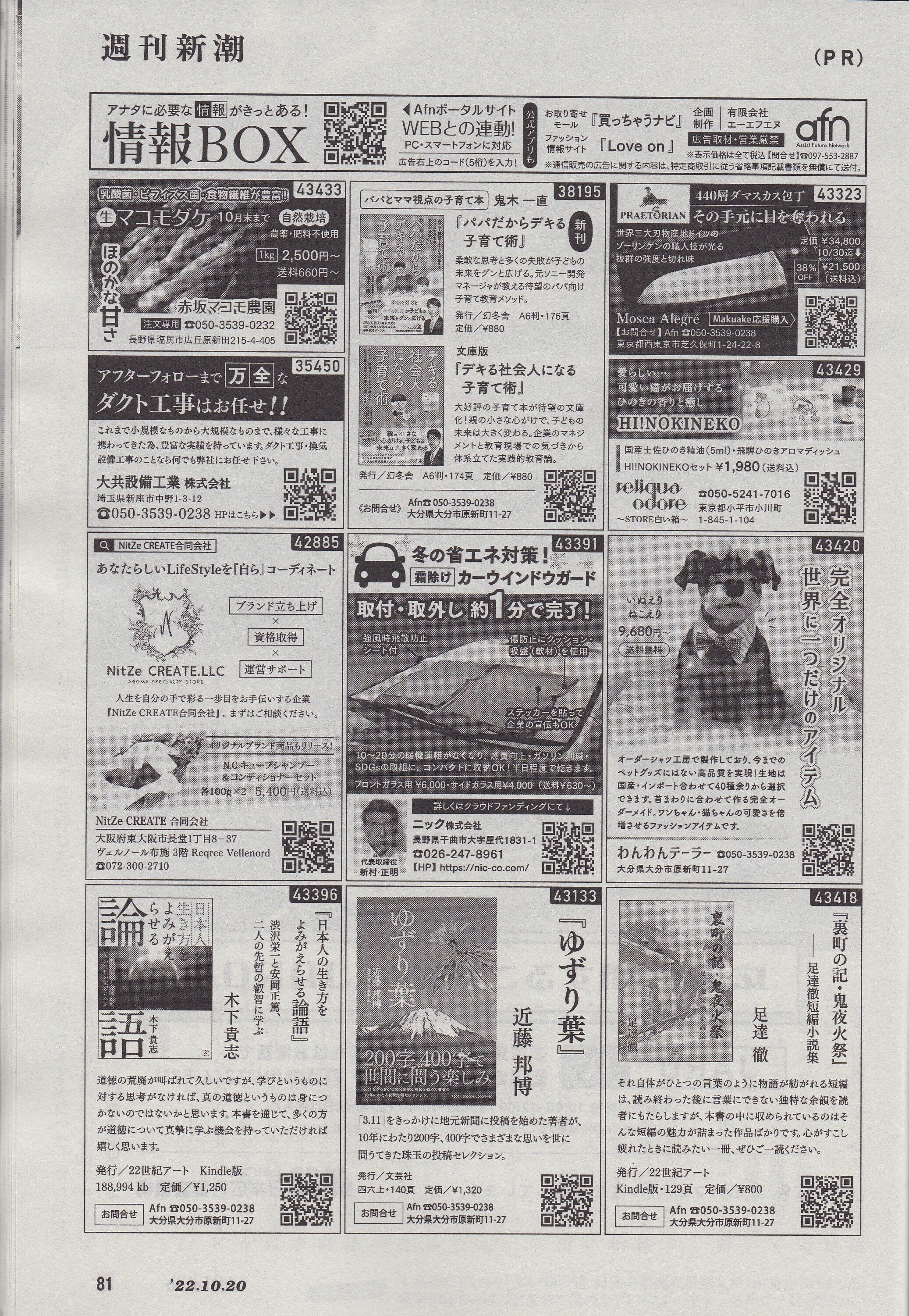 2022/10/13 08:4610月13日発売の週刊新潮(10月20日号)に広告掲載いたしました。より多くに人に知っていただけたら幸いです。 もっと見る