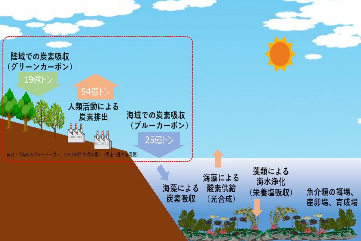 藻場は、アワビやウニなどの餌場や魚類等の産卵場や稚魚の育成の場としての役割を担うとともに、陸域から流入する有機物や窒素やリンなどの栄養塩を吸収して水の浄化機能も有しており、漁場・海洋環境に重要な役割を担っています。また、最近は、海藻の二酸化炭素吸収・固定(ブルーカーボン)する能力が高いことが分かり、地球温暖化の影響を緩和する機能も有しており、地球環境を維持する大きな役割も担っています。
