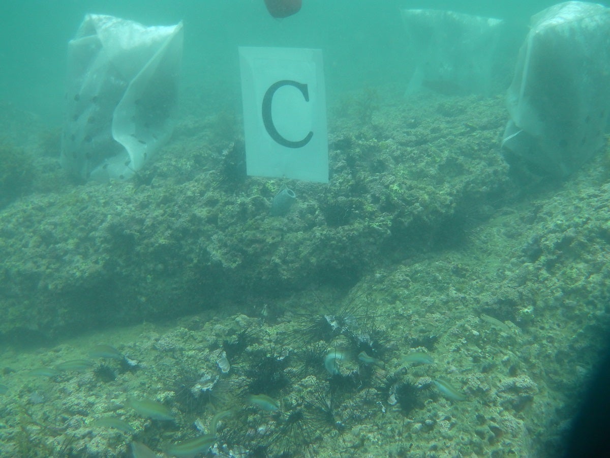 唐津沿岸域では、20年ほど前から南方系の国内外来種である大型藻食性ウニのガンガゼが分布するようになり、磯焼けが拡大しています。藻場は、魚類等の産卵場や稚魚の育成の場としての役割や食料生産の場としても重要な役割を担っています。また、水中の窒素やリンを吸収して海水を浄化する機能や、二酸化炭素を吸収・固定することで、地球温暖化の影響を緩和する機能も有しており、地球環境を維持する大きな役割も担っています。「磯焼け」は、藻場が有するこれらの多くの機能が失わていることを示すとともに、漁業生産にも大きく影響を及ぼしています。