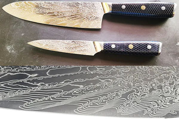 ダマスカス鋼は強靱さと錆びにくさ、刃の表面の美しい模様が特徴です。