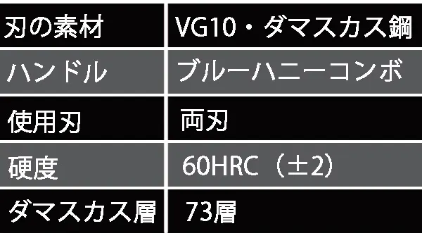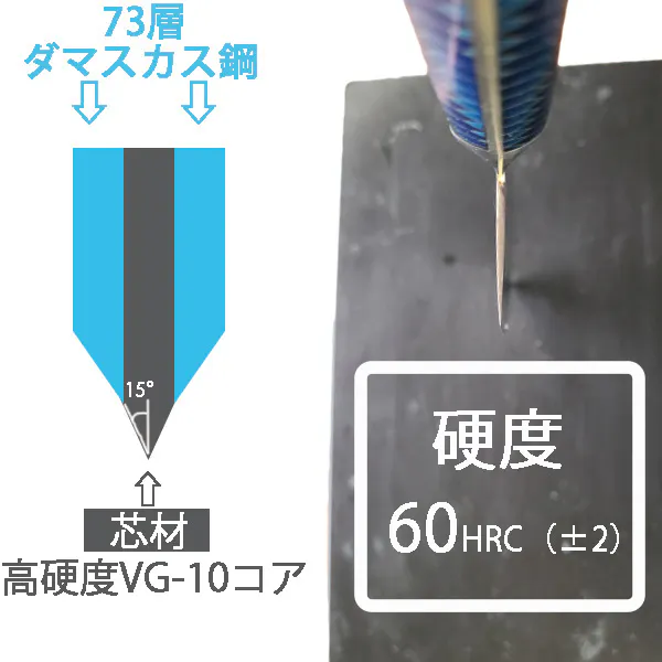 ※VG10は、カーボン(窒素)、クロム、バナジウム、モリブデン、コバルトを含んだ鋼材です。そのため固く頑丈で切れ味が良く錆びにくくお手入れがしやすくなっています。