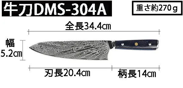 このダマスカス包丁の重量は「DMS304A→270g」 「DMS304F→120g」となっています。