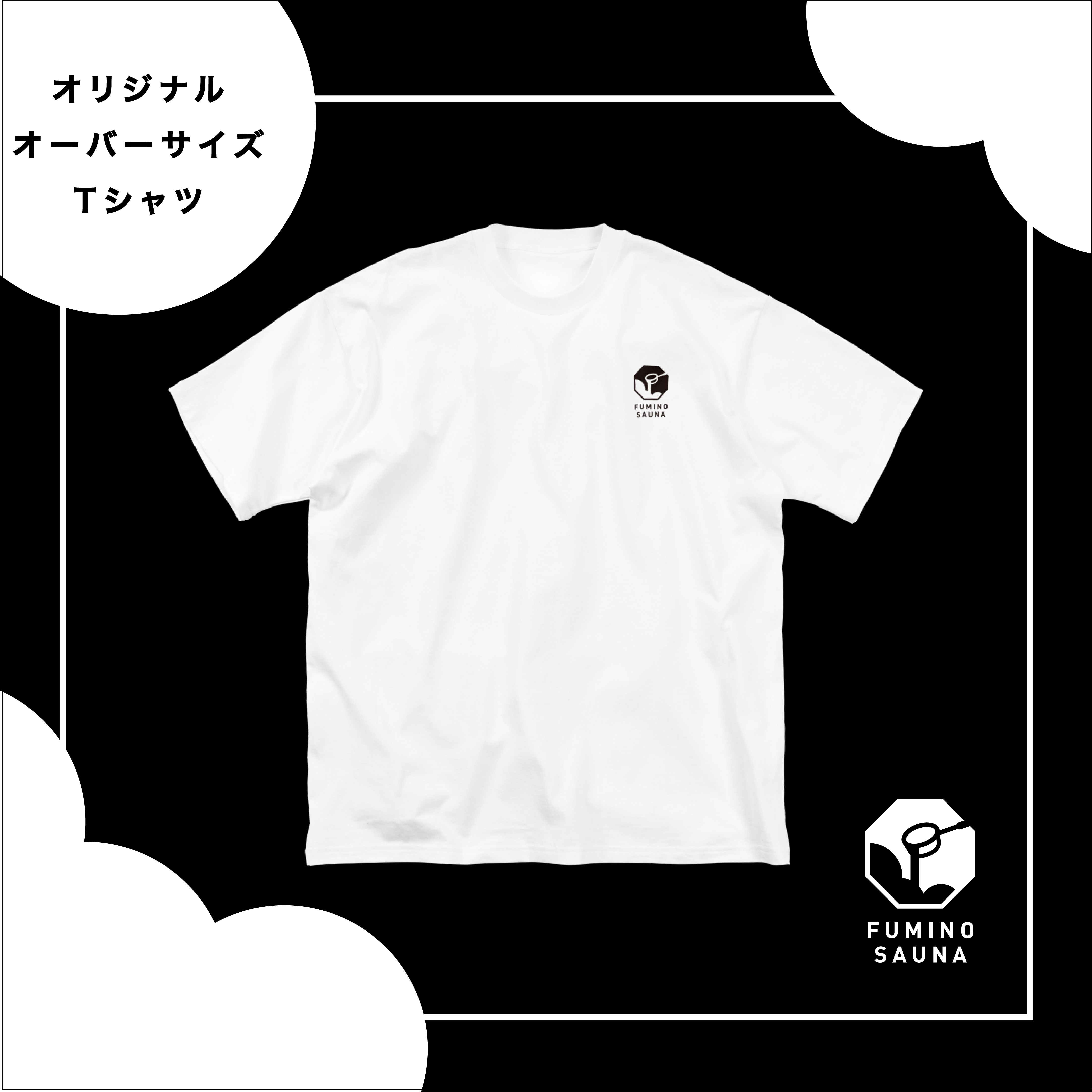 サウナでととのう日にゆったり着用できるよう、ユニセックスのオーバーサイズ(フリーサイズ)でご用意しました。白い生地に黒いロゴ入り。