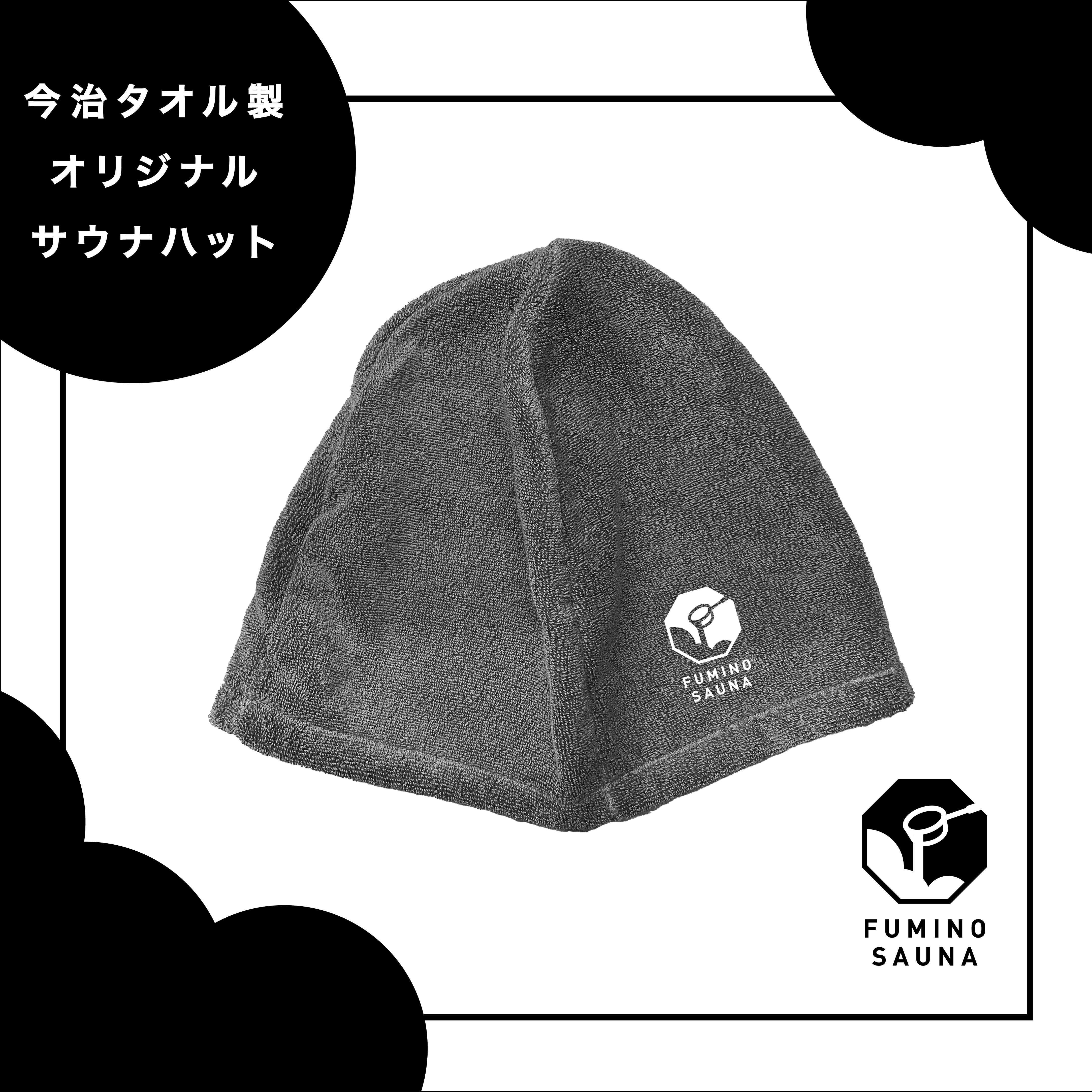 長く使い込めるよう、今治タオルの上質な生地で作りました。フリーサイズ。黒い生地に白いロゴ入り。