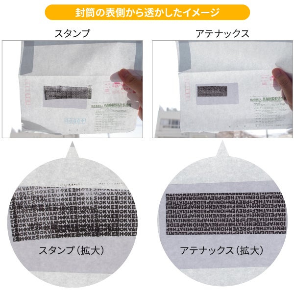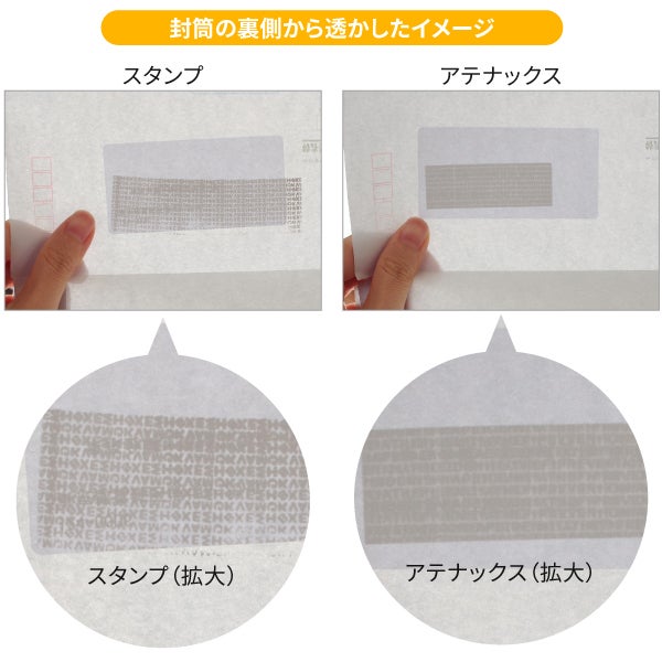宛名を透かして見たときでも、アテナックスは透けにくい特殊パターンを両面に印刷することで、より透けにくくなっています。