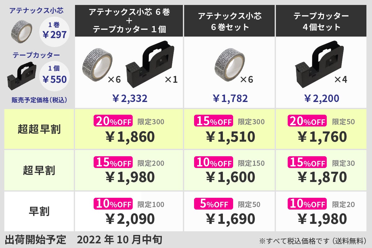 わたくしたちは、宛名消しテープ『アテナックス(ATENAX)小芯タイプ』を製作するために、現在、デザインや仕様の最終検討をしてプロジェクトが実現できるよう誠心誠意進めています。