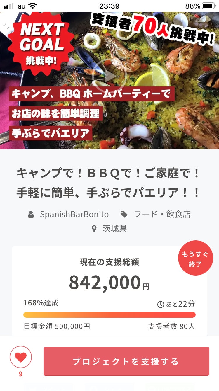 こんにちは!改めまして、「手ぶらでパエリア」をつくばから全国に届けたいという想いから始まりました今回のクラウドファンディングプロジェクトにご支援ご協力頂きまして、ありがとうございました!10月7日の掲載開始から昨日11月30日をもって無事終了致しました。プロジェクト目標&ネクストゴールのW達成することが出来たのも、全てご支援して頂いた皆様お一人お一人のお力添えがなければ達成できませんでした!特に最終の2日間で、今までの約2倍のご支援頂きまして、ネクストゴール目標達成できました!クラウドファンディングが終了しましたが、ここからが本当のスタートになります。進捗ありましたら、またご報告させて頂きます。リターン品も2023年1月中旬頃になる予定しておりますが、ご準備でき次第随時発送させて頂きます!社会状況の変化により商品の納品に変更等ございましたらまたご連絡差し上げます。ご質問等ありましたら、店舗までお気軽にお問い合わせください!今後は、店舗でのご予約販売、ECサイトBASEでショップ開設順備してありますので、追加のご注文や、新商品の販売はそちらからご注文頂ける予定です。こちらもまたご案内差し上げます!今回のクラウドファンディング初挑戦!不安と、ドキドキから始まりましたが、ご支援、ご紹介そして応援のコメントを頂いて、たくさんの元気と未来に挑戦していく勇気を頂きました!この機会に初めて当店を知って頂いた方もいらっしゃると思います。これも何かのご縁だと思っております。Spanish Bar BONITO そして、「手ぶらでパエリア」をはじめとする、お手元にお届け出来るBONITOの商品に変わらぬご支援、ご愛顧よろしくお願い致します。寒暖差が激しい季節になってきましたので、ご体調にお気を付けてお過ごし下さい。 2022年 12月1日 株式会社Bonito 代表取締役 小野 将弘