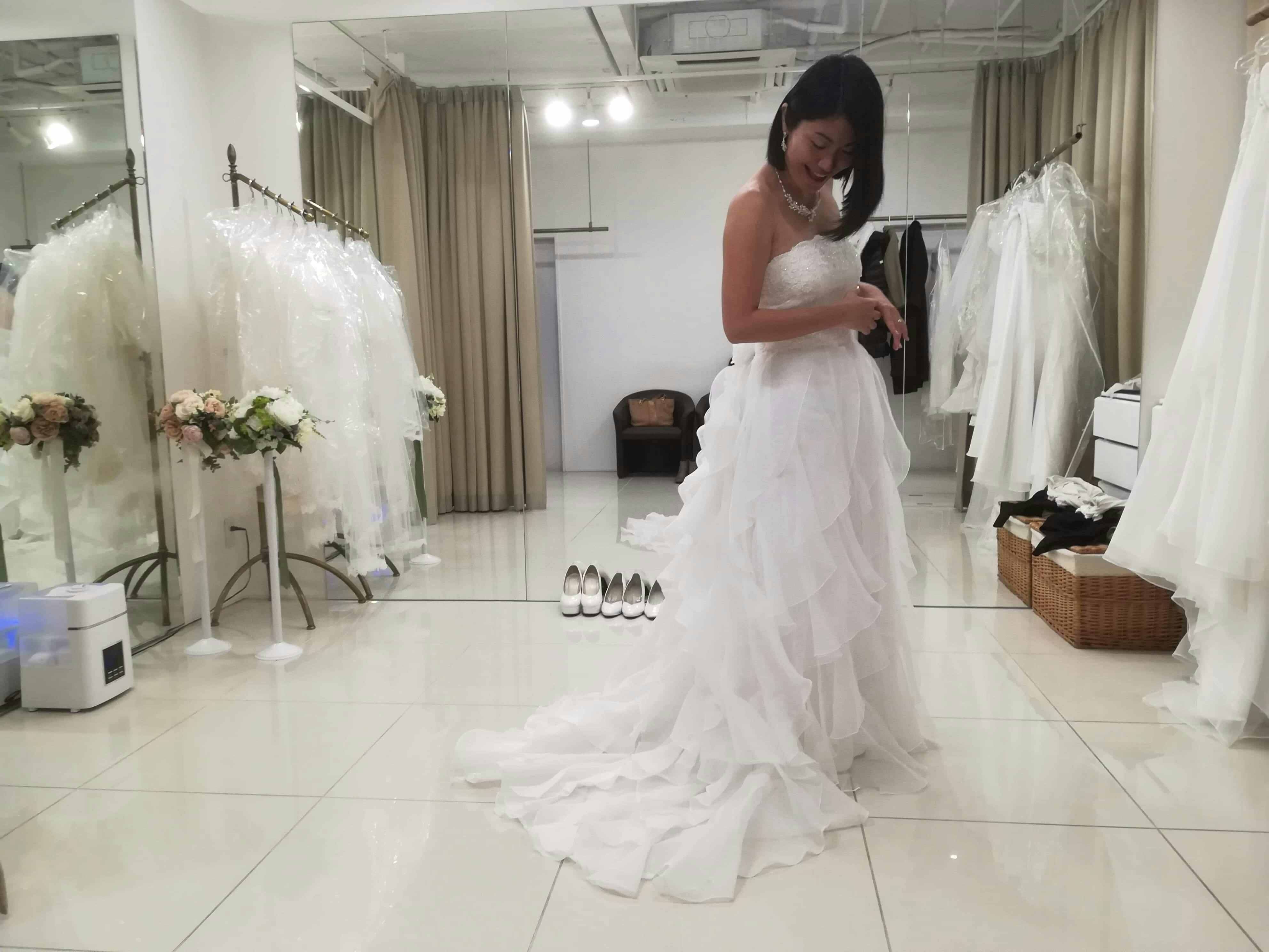 ※ ちなみに写真はウェディングドレスを試着した時のもの。このドレスで即決、ファーストミートでは夫にも好評でした♡