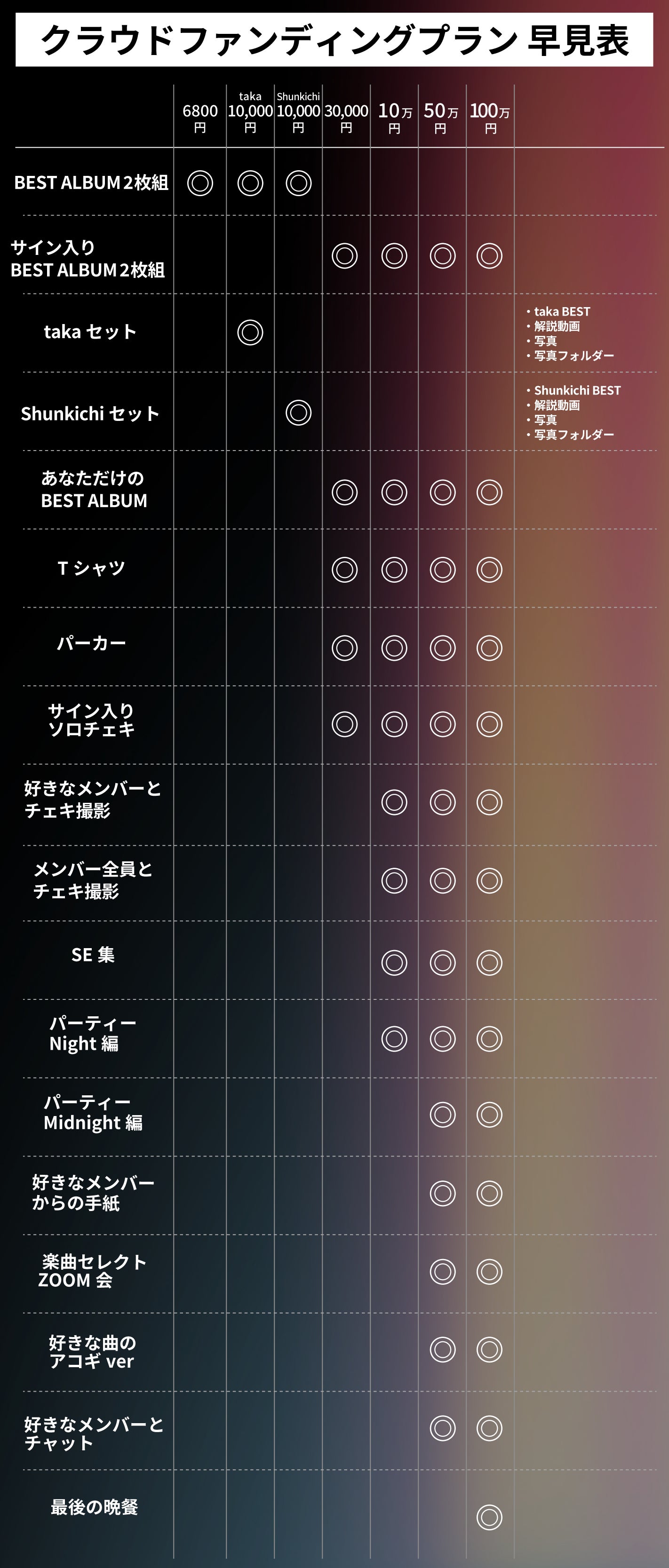 A:メンバー4人とご支援者様のオフ会となります。その他詳細につきましてはご支援いただいたお客様との個別やりとりにてお送りいたします。