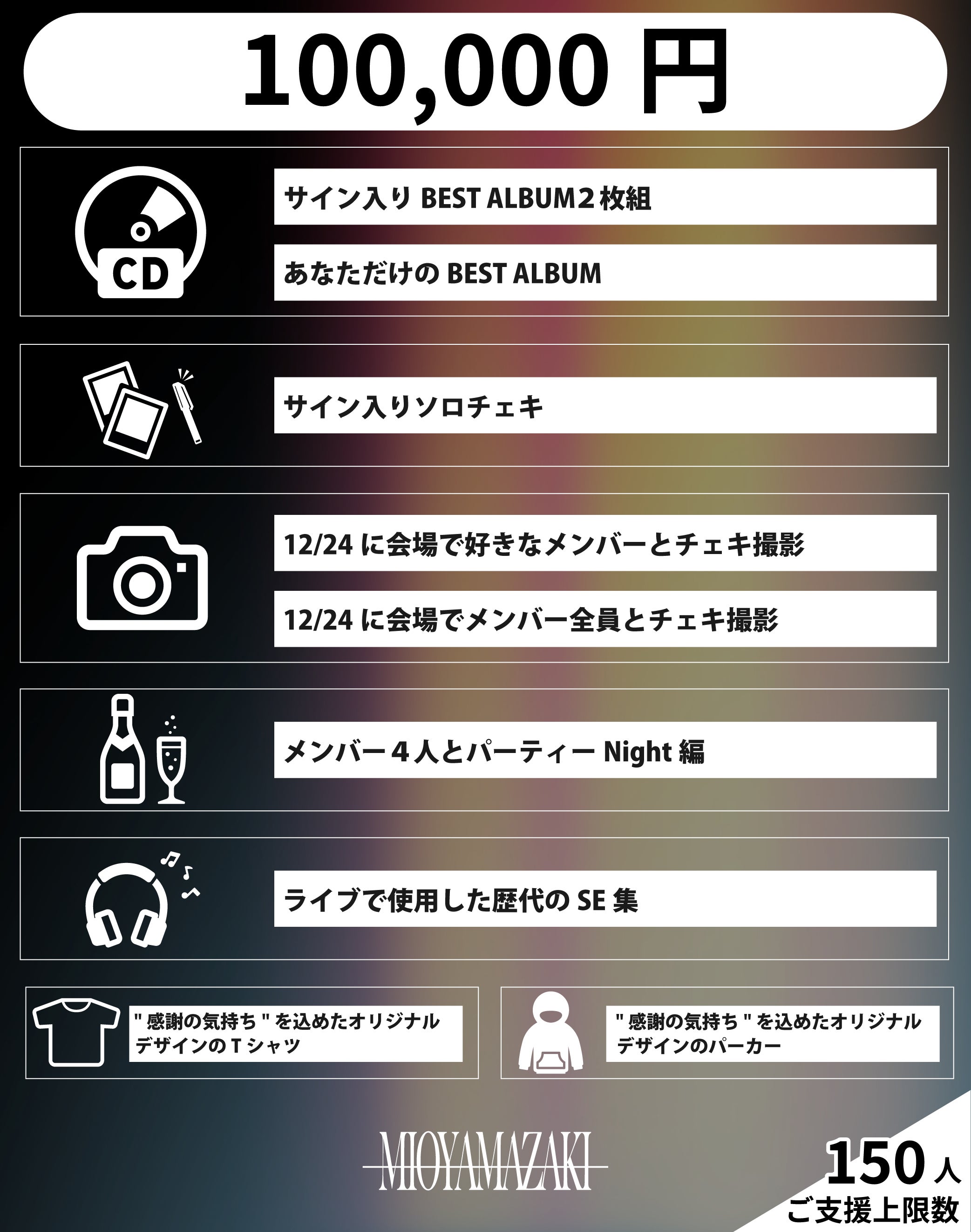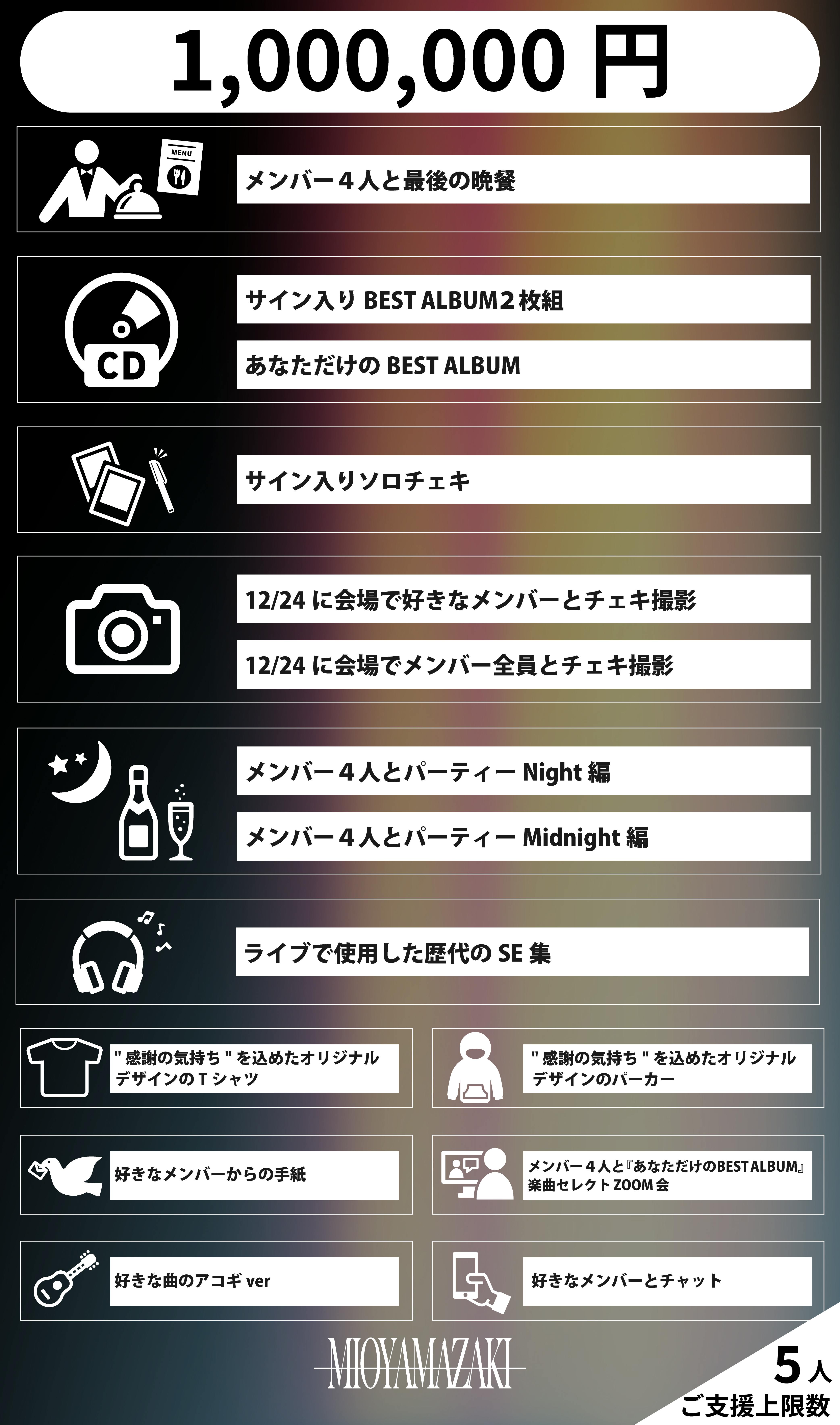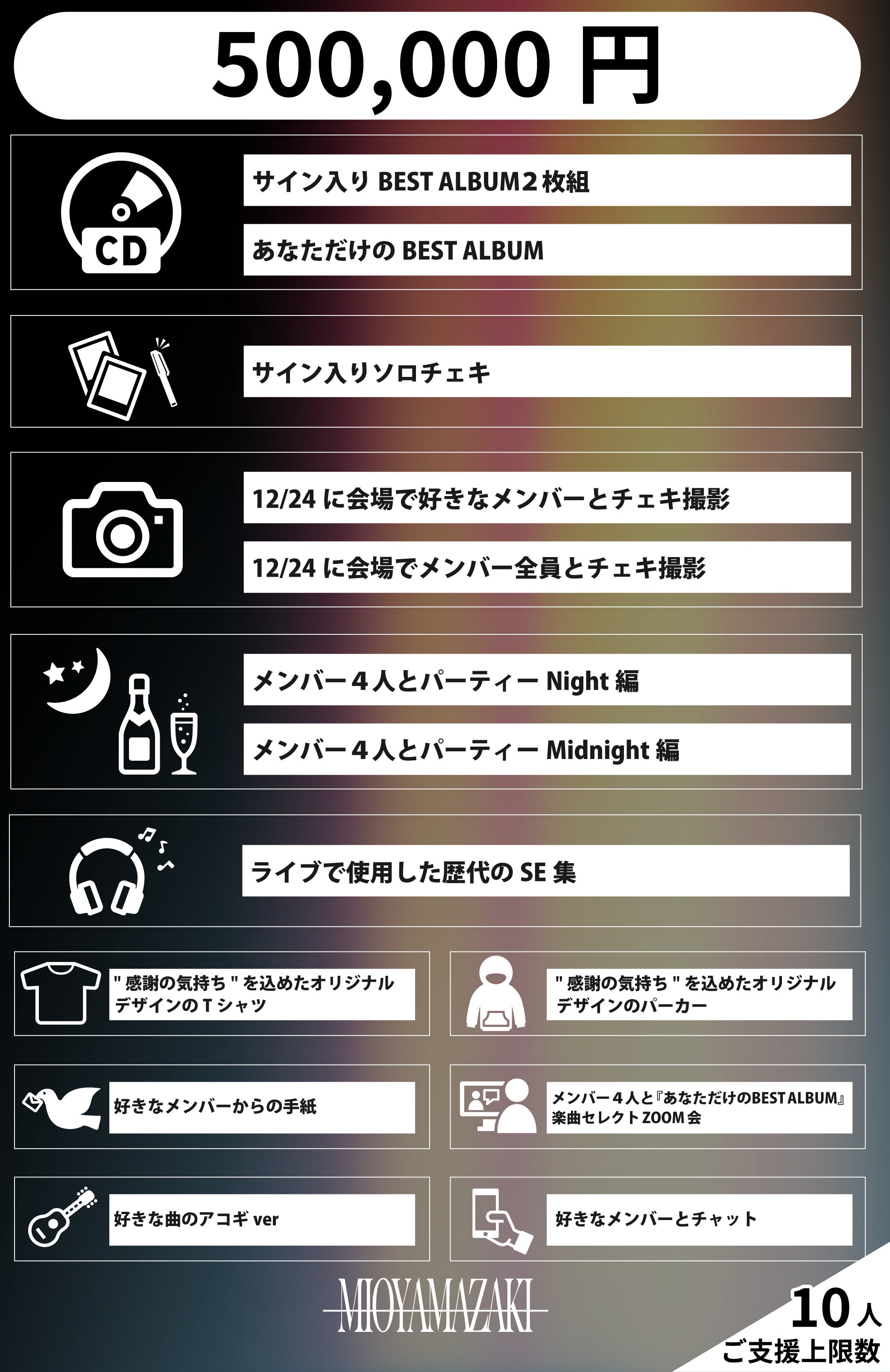 ミオヤマザキの4人がいて、みんながいて、その真ん中にたくさんの曲がある。この最幸の物語をいつか振り返った時に、できるだけこの幸せを強く深く刻んだモノを私達は残したかった。それはたぶんベストアルバムなんだろうと思いました。だから私達4人のミオヤマザキが最後に残す物語としてベストアルバムの制作を目指します。