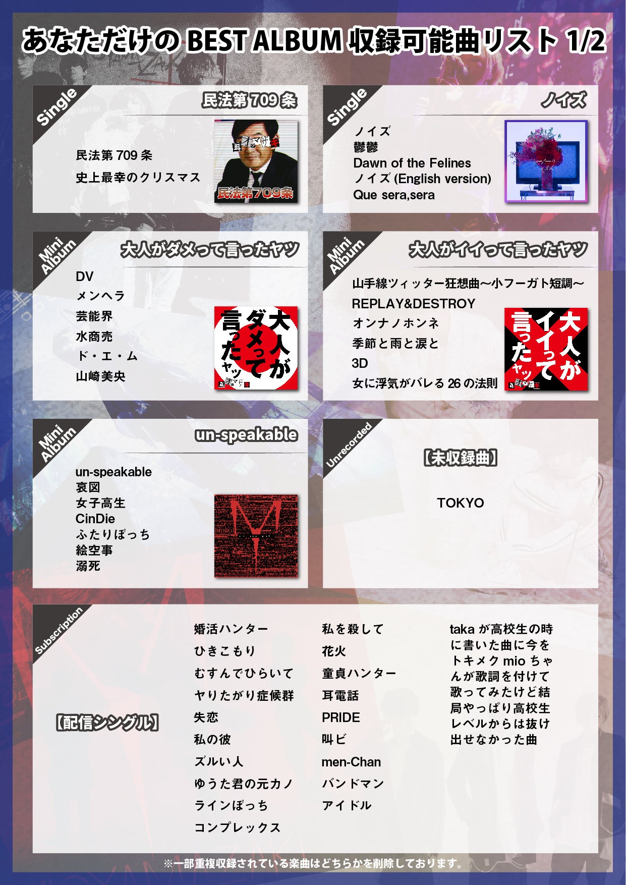 ミオヤマザキのメンバーが選び抜いた2枚組24曲入りのBEST ALBUMにtaka直筆の一言メッセージを付けてお届け!