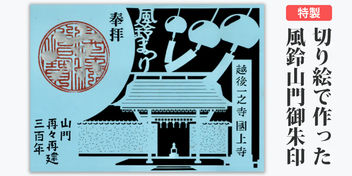 風鈴祭りに際し、切り絵の風鈴御朱印をご用意しました。国上寺の山門と風鈴をデザインした特別な切り絵の御朱印です。国上寺で1枚1枚「涼」の文字を墨書きしてお送りいたします。