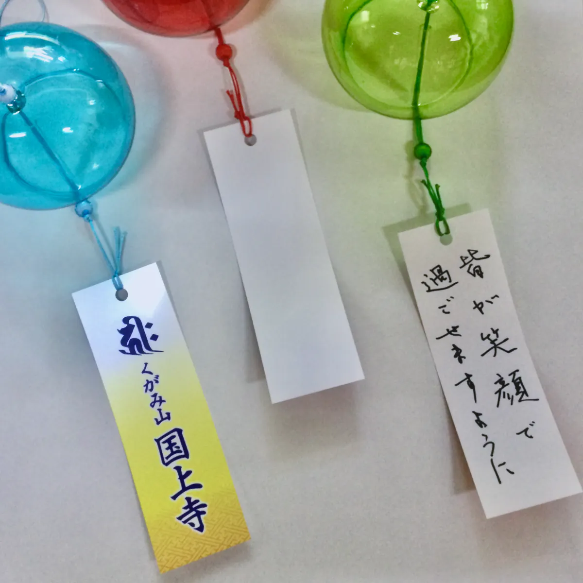 山門の風鈴に掛けられる願いを書き込める短冊。七夕風鈴まつり終了後に、短冊の裏に皆さまの幸せを願うメッセージを書いてお届けします。全てのリターンに1枚含まれます。