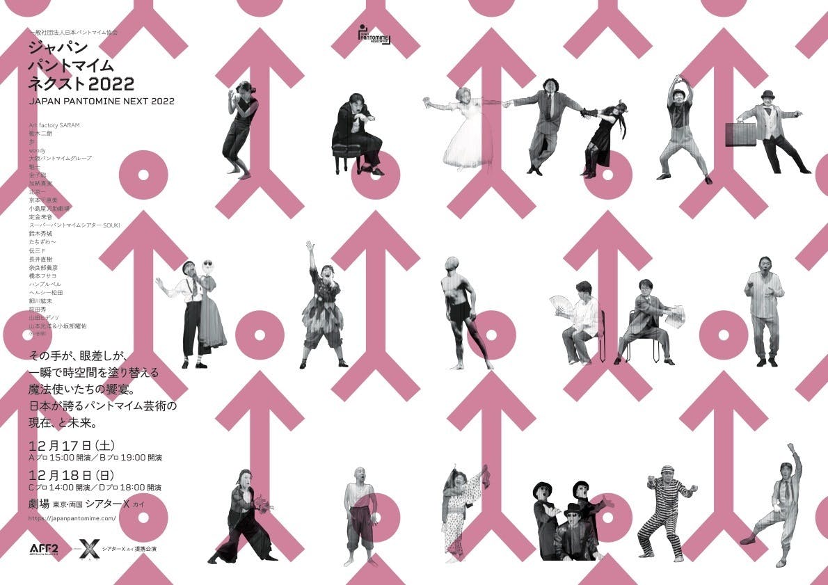 元気なピンクのマークは、ネクスト(矢印)感とパフォーマー(身体)を組み合わせたモチーフです。シンプルながら、パントマイムの多彩さがわかる目立つビジュアルになりました。