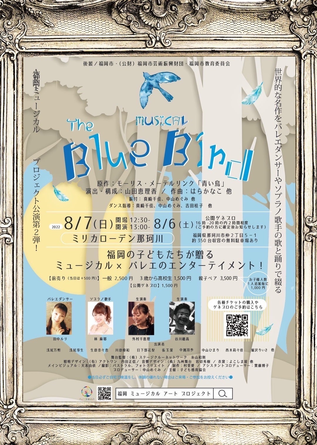 本年も同じく、8月7日(日)に福岡県のミリカローデン那珂川にて、福岡市内の子ども達×プロのダンサーや歌手によるミュージカル「The Blue Bird」を開催します。