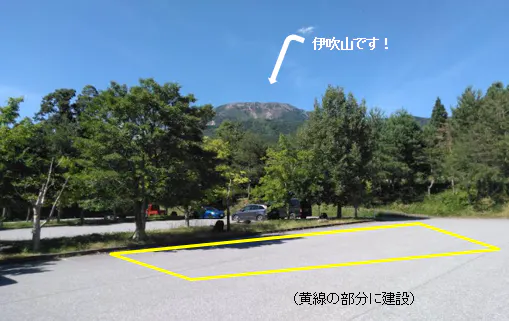 伊吹山が見える駐車場の一角をRVパークに改装します。AC100vの電源を1台ごとに設置し、6台分のスペースを予定しています。
