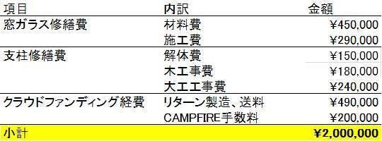資金の使い道は主に『割れたままになっている窓ガラスの修繕費用』と『腐りかけの支柱修繕費用』に使用させていただきます。