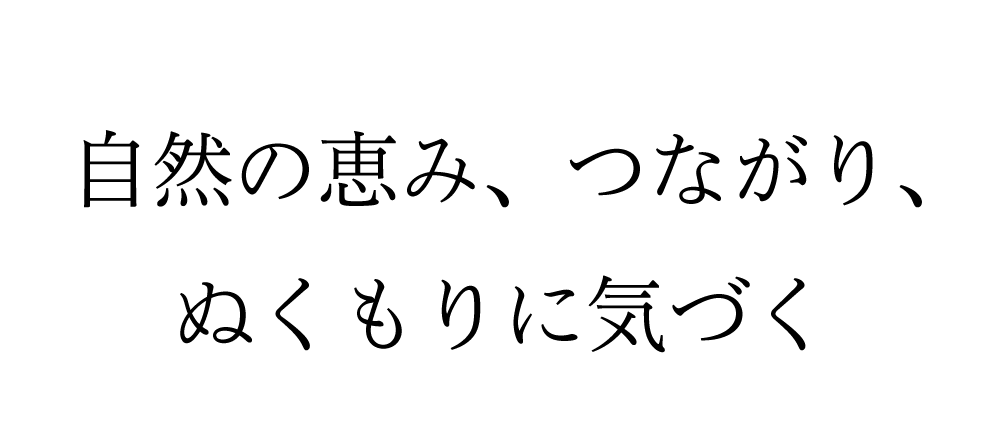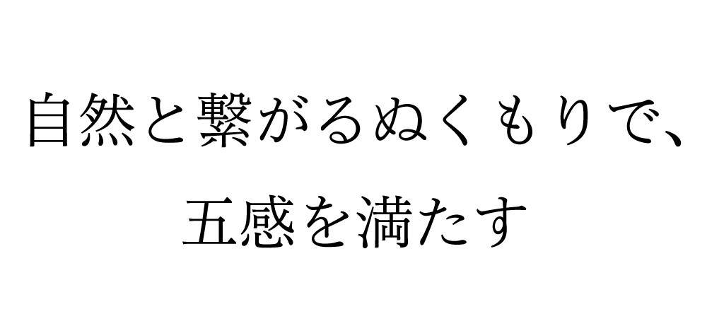 自然のぬくもりとは、ジリジリとした日差しの暑さだったり、雨粒が肌を打ち地面を打ち流れていくこと、パチパチという薪の音や炎のゆらぎ、サワサワとした木々が揺れる音、ひぐらしのオーケストラであり、それぞれが織りなすハーモニーのことです。それを研ぎ澄まされた五感で感じることで、深くまわりと、そして自分とつながることができます。