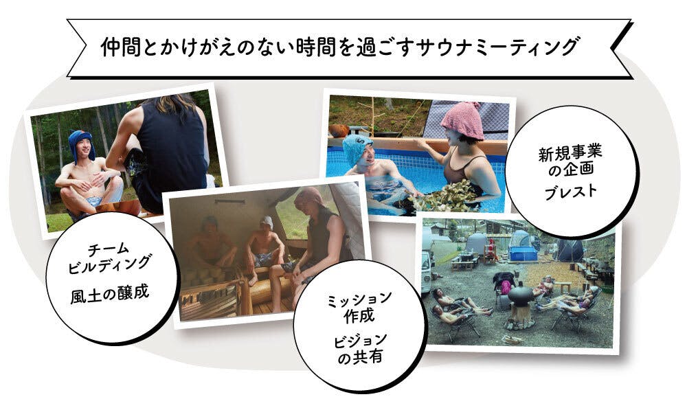 最近、職場から離れた場所で行う「オフサイトミーティング」という言葉を耳にするようになりました。堅苦しいジャケットを着て、難 しい顔をしながらキンと蛍光灯が照らす会議室でのミーティングから抜け出して、青空のもとでジャケットどころか靴も靴下も脱ぎ捨 てて裸足になってサウナミーティングしましょう。ここで仲間と対話する時間は、いつもの会議室とはひと味もふた味も違う、クリエイティブでハートトゥハートなひとときになることでしょう。そんな時間を想像しただけでワクワクしませんか?