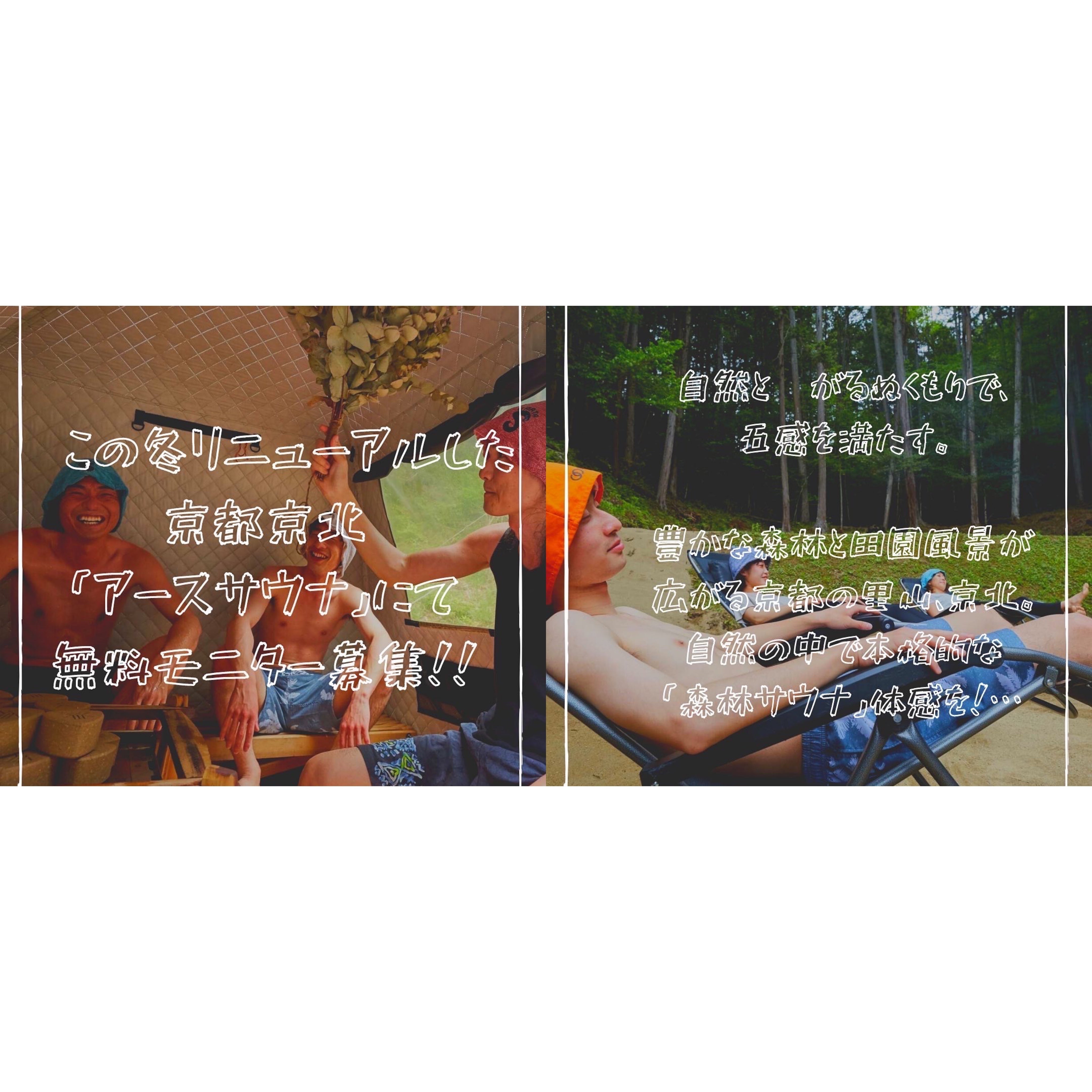 豊かな森林と田園風景が広がる京都の里山、京北。この冬リニューアルした京都京北「アースサウナ」にて、広がる青空と森に守られた空間で、テントサウナを楽しみましょう。