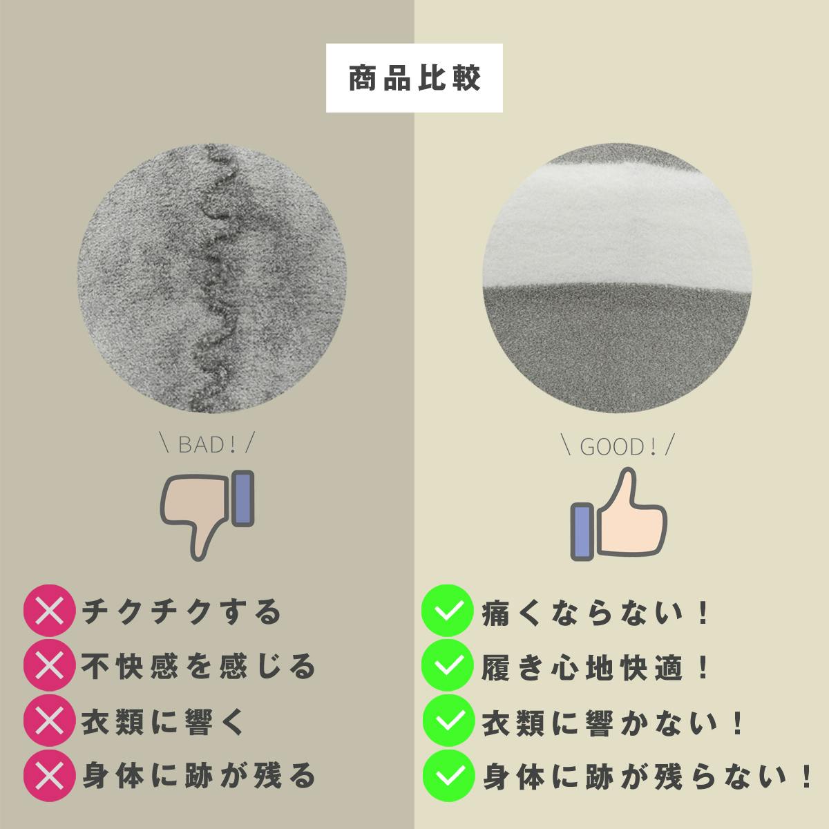 縫い目がないことによるメリットは、ストレスフリーな着用感、縫い目が肌と擦れないから低刺激、他の着用商品に響きにくい、などが挙げられます。