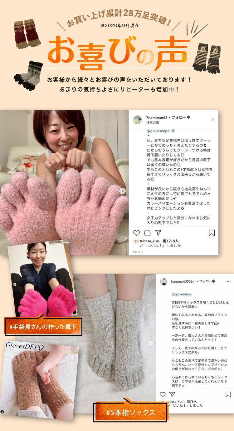 たくさんのお客様から「温かくて履いていて気持ち良い」「冷え性も改善された」「一度履くと病み付きで今ではすっかりリピーターです」などとご好評いただき、若い方からシニアまで老若男女、幅広い層からご愛用いただいています。