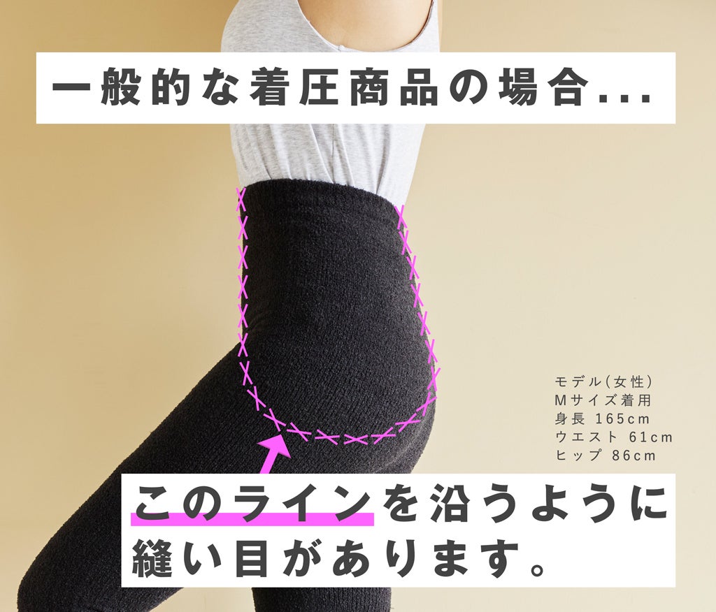 一般的な着圧商品の場合、股を半周するような形でぐるっと分厚い縫い目があり(上図のピンク色のライン参考)、それが原因で正面から見ると食い込んでいるように見えたり、股に違和感を感じたりと、不快に感じる方はいらっしゃいます。