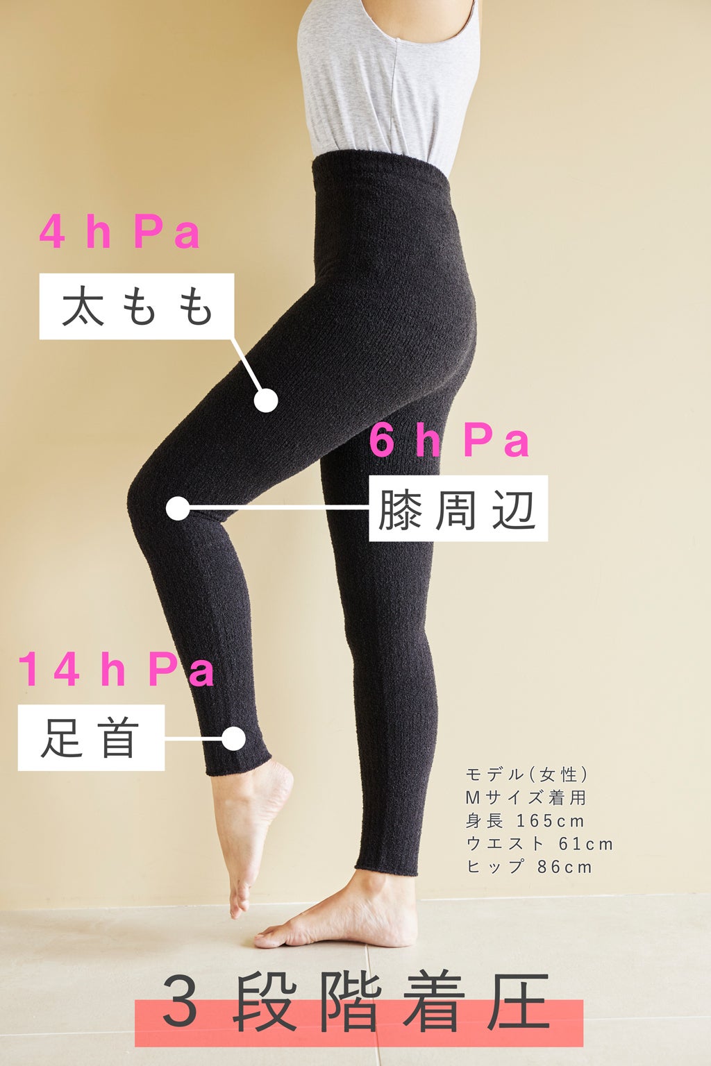 本商品は、足首から太ももにかけて段階的に圧力を掛けているのでマッサージ効果が期待できます。また、上記でお伝えしたシュークリーム糸の特徴からも本商品の温かさは実証済みで、一般的な着圧商品にはないダブルの効果で血行を良くする仕組みがあります。