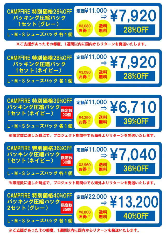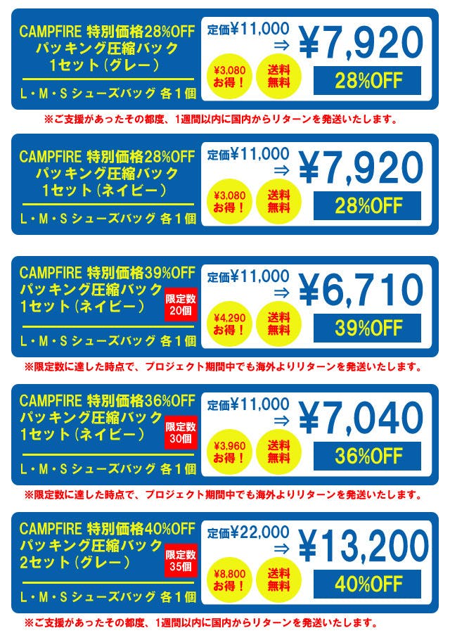 2022/10/13 11:06サポーターの皆様このたびは多くのご支援をいただきましてありがとうございます。プロジェクトが終了しましたので、リターンの配送の準備に入ります。グレーの圧縮バッグとワイシャツケースをご支援いだだきましたご支援者様は国内からの発送となり、ブルーの圧縮バッグは海外よりの発送となります。そのため両方をご支援いただきましたご支援者様は、それぞれ別にリターンのお届けになりますのでご了承ください。宜しくお願い申し上げます。 もっと見る
