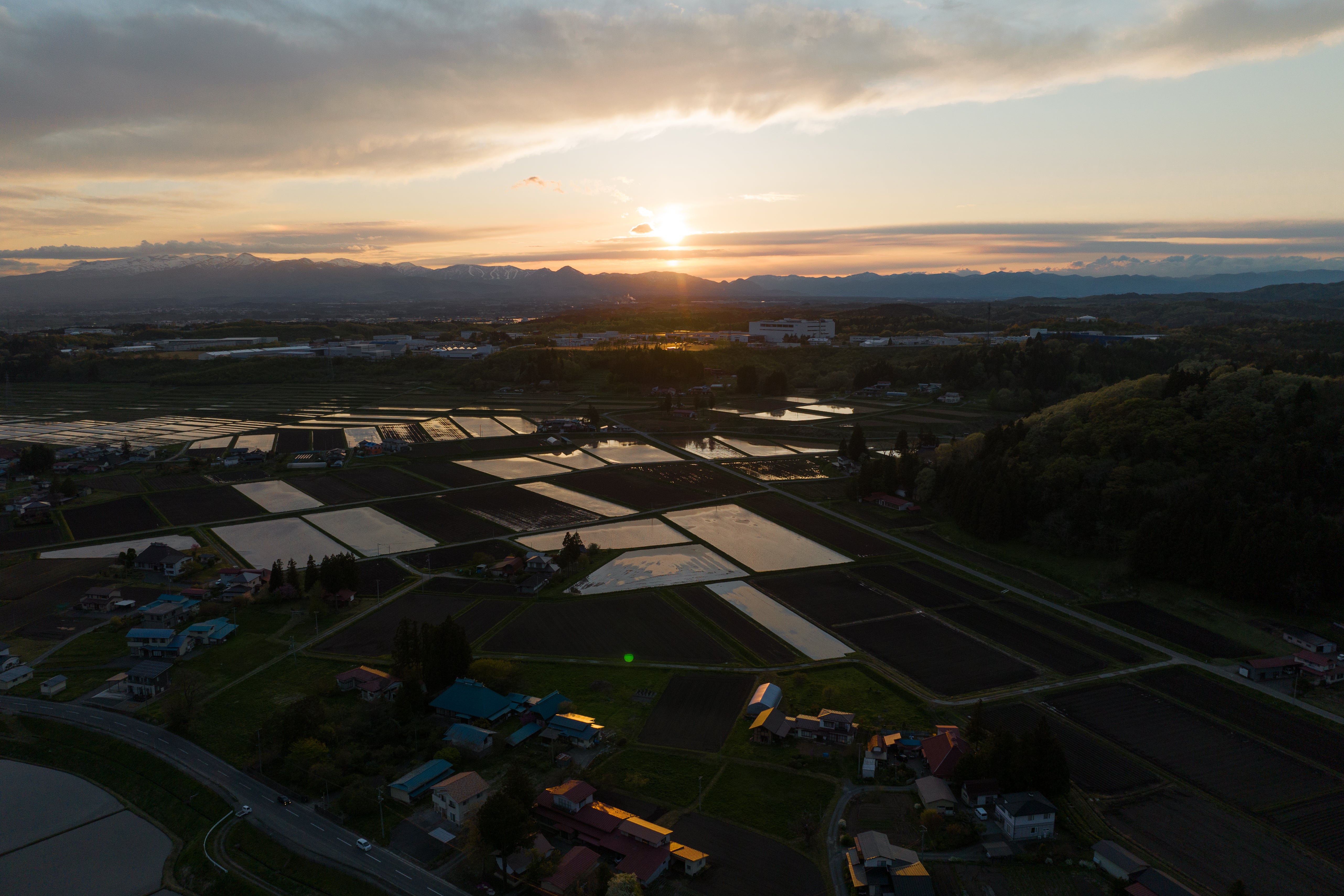 自宅上空から撮影した江刺のまちなみ 美しい田園風景が広がります。