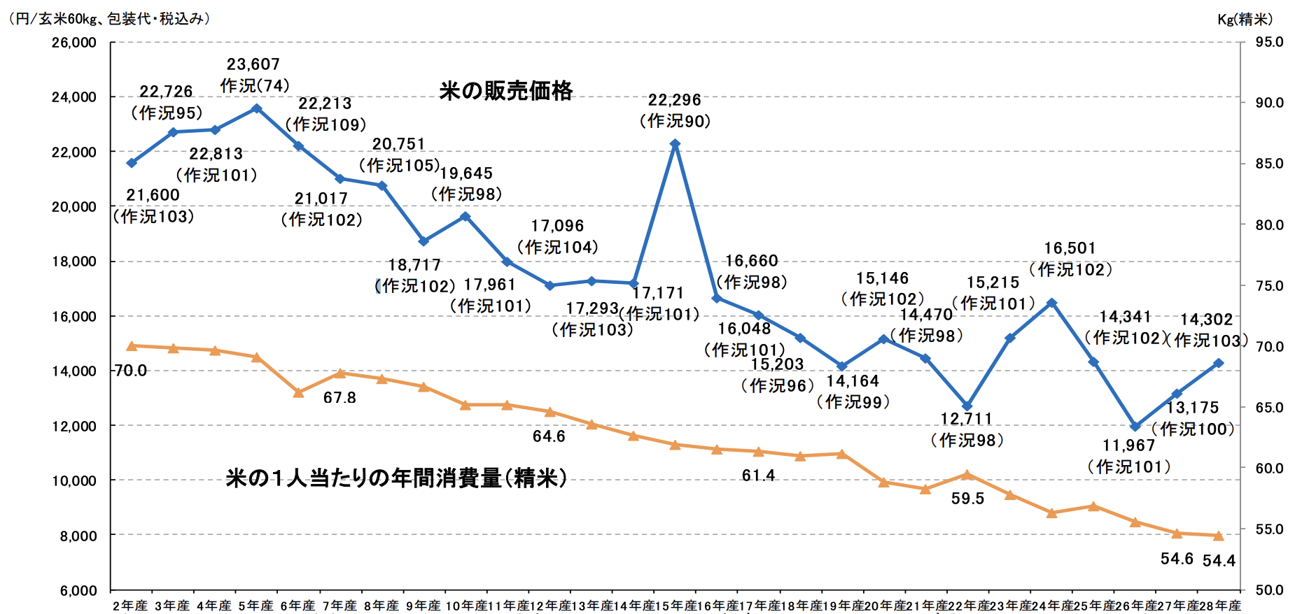 ①青いグラフはここ数十年のお米販売価格の推移
