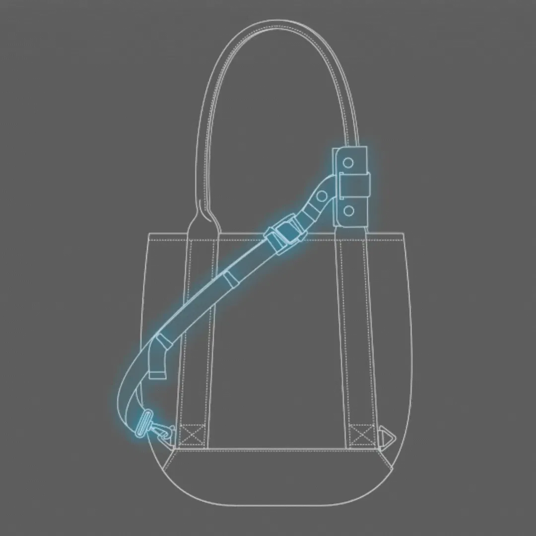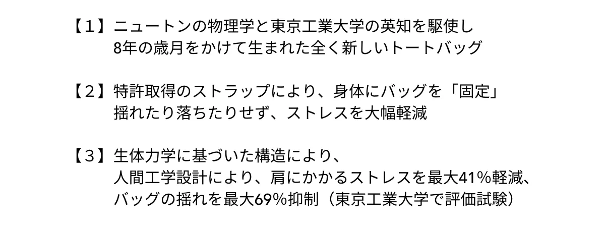 それは会社からの帰り道、トートバッグを肩にかけたまま坂道を自転車で下っていた時の事です。突然、肩から滑り落ちたトートが自転車の前輪に挟まって転倒、背中を強打。とても痛い思いをしました。ファッション性と使い易さから、普段からトートバッグを愛用していましたが、この転倒を経験して以来、自転車に乗りながらの使用に恐怖を感じ、控えるようになりました。かといって、中身を取り出すのに着脱が必要なリュックや、本や書類があまり入らないメッセンジャーバッグやワンショルダーは、自分としてはイマイチ。「身体に固定できるトートバッグ」があれば、と考えるようになったのは、その頃からでした。そして、トートバッグのデザインはそのままで、ストラップによって簡単に身体に固定ができ、安全に自転車に乗る事もできて、両手も自由になる「固定式トートバッグ」を思いつきました。試作品を実際に使ってみると、これまでのトートと異なり、両手が自由になるばかりか身体への負担が少ないことも実感。固定することで荷物の「揺れ」も軽減され、ラクに感じることがわかりました。そして、生体力学の准教授の協力のもと、試行錯誤を繰り返し、約8年の歳月をかけて完成。