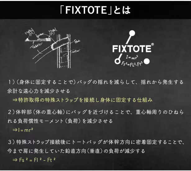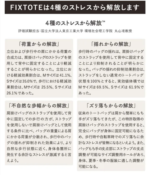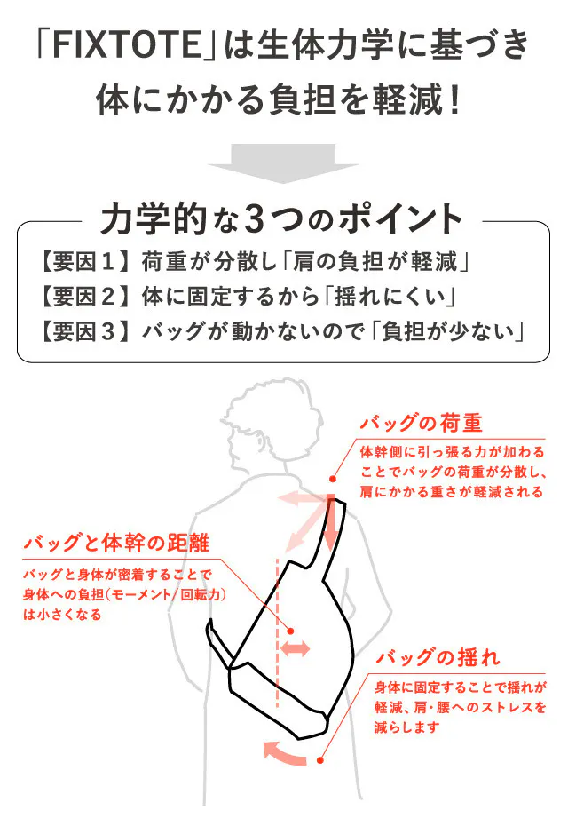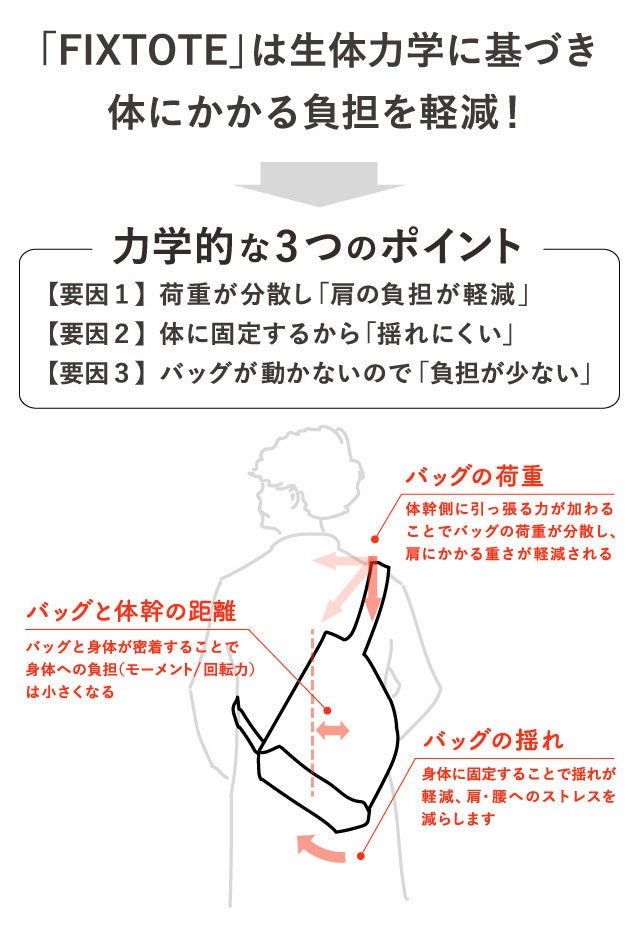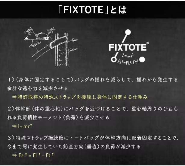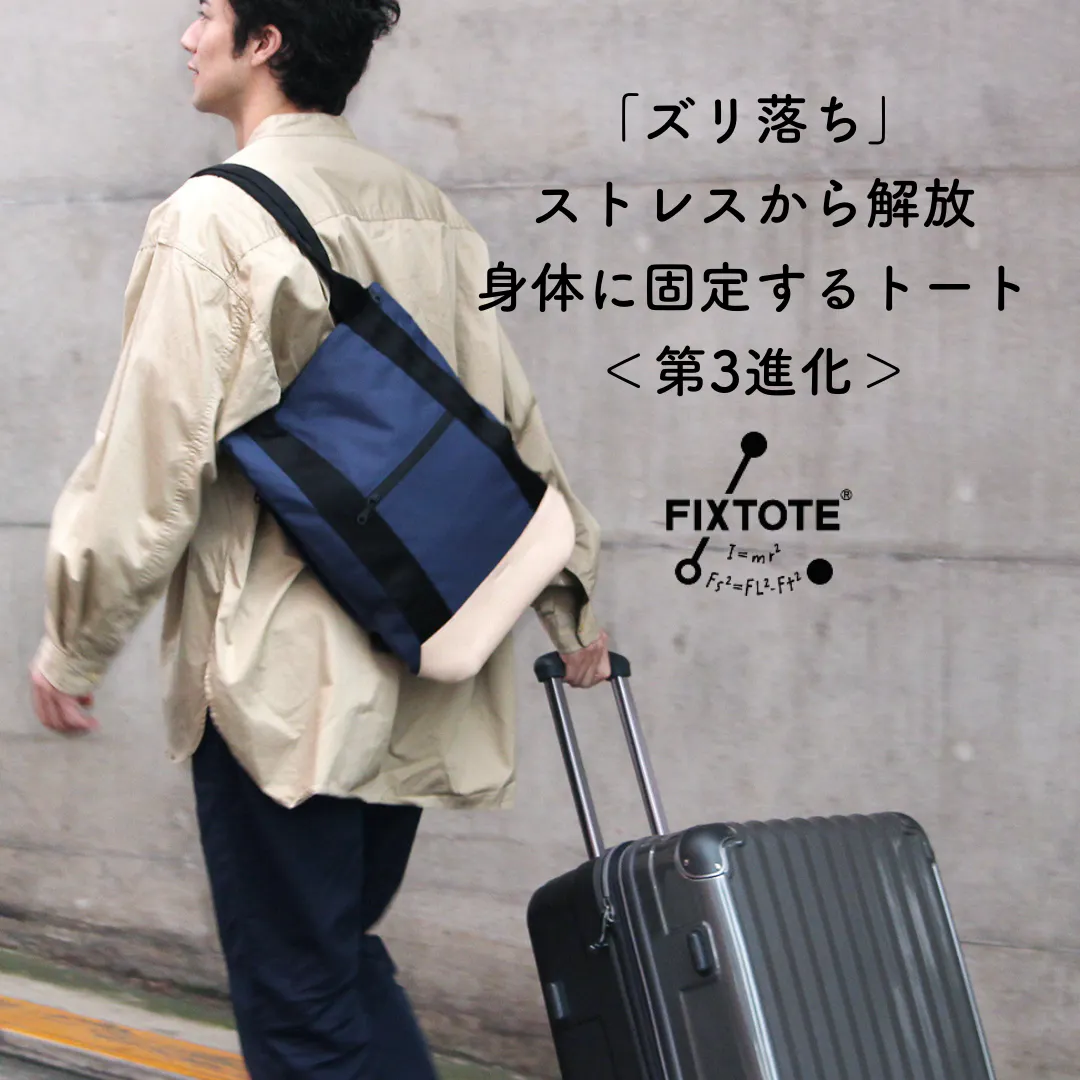 「FIXTOTE」は身体に発生する4種の負荷(ストレス、イライラ)を減少し、リュックのように両手がフリーになり、肩からズリ落ちしないトートバッグです。