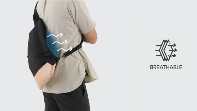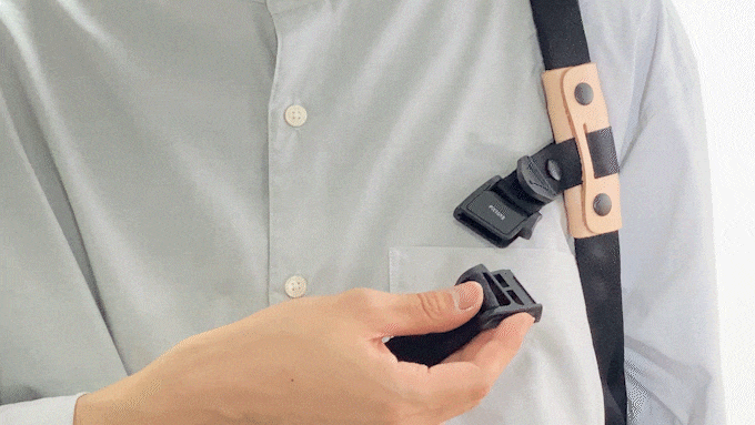 ▲上の青い表示部のストラップで身体にバッグを固定し両手がフリーに▲