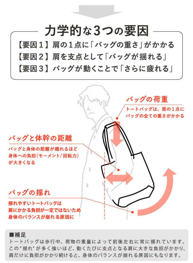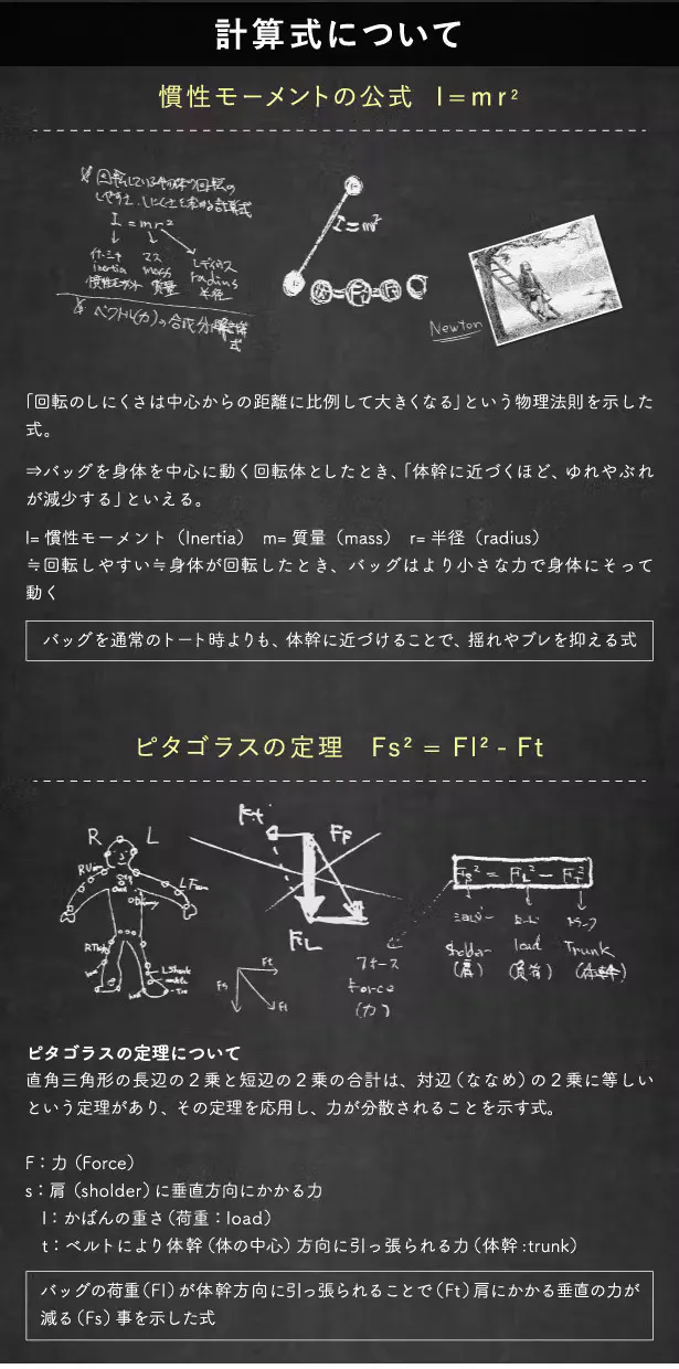 FIXTOTEは【国立 東京工業大学 環境社会理工学院 生体力学専攻 丸山准教授】から長年のご指導のもと、生体力学的観点から「カバンが発生する身体にかかる各負荷をいかに減少」させるかというコンセプトで生まれた、