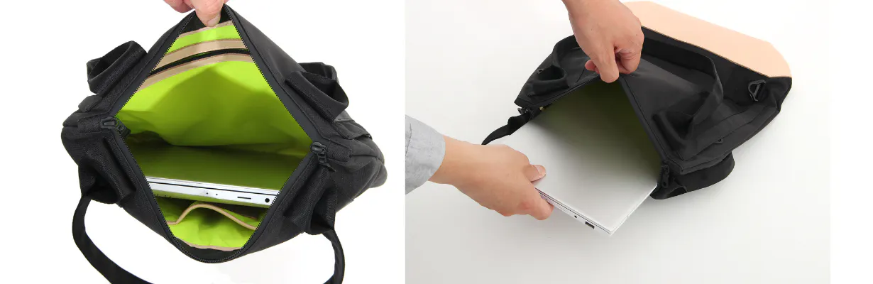 MサイズはA4サイズの書類やタブレット、一般雑誌など出し入れしやすいサイズです。Mサイズは、13.3インチ程度のノートPCも収納できます。