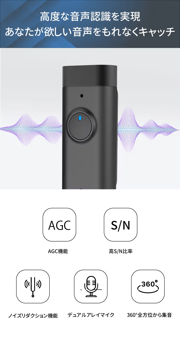 録音をしてもクリアな音声が取れてないと意味がありません。高精度な録音をするためにAGC(オートマチックゲインコントロール)、高S/N比、ノイズリダクション、デュアルアレイマイク、360°からの集音を実現し、あなたが聞きたい音声を漏れなく録音します。