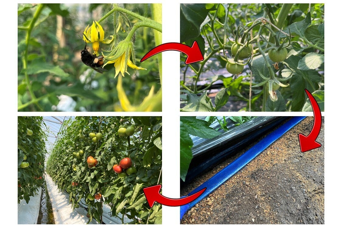 (左上)ハチによる受粉、(右上)3~4つに摘果したトマト、(右下)追肥、(左下)収穫期のトマト