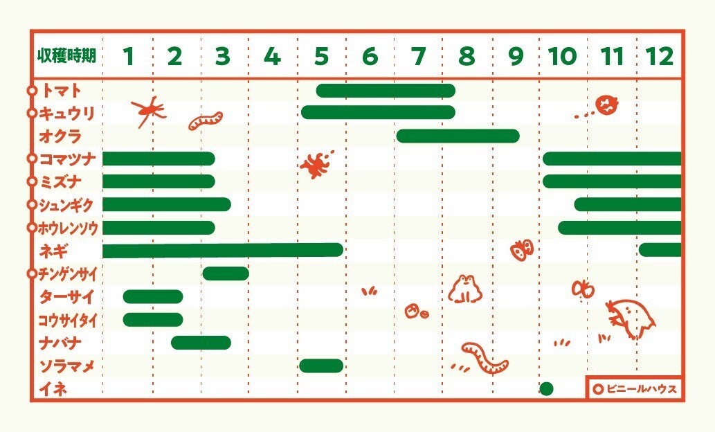 夏は、トマト、キュウリ、オクラ。冬はコマツナ、ミズナ、ホウレンソウ。
