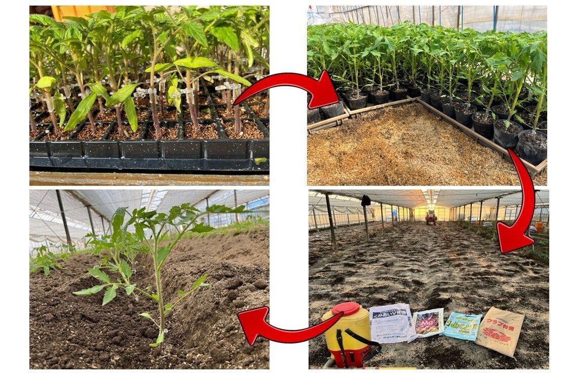 (左上)セル苗、(右上)ポット苗、(右下)土づくり、(左下)定植した苗
