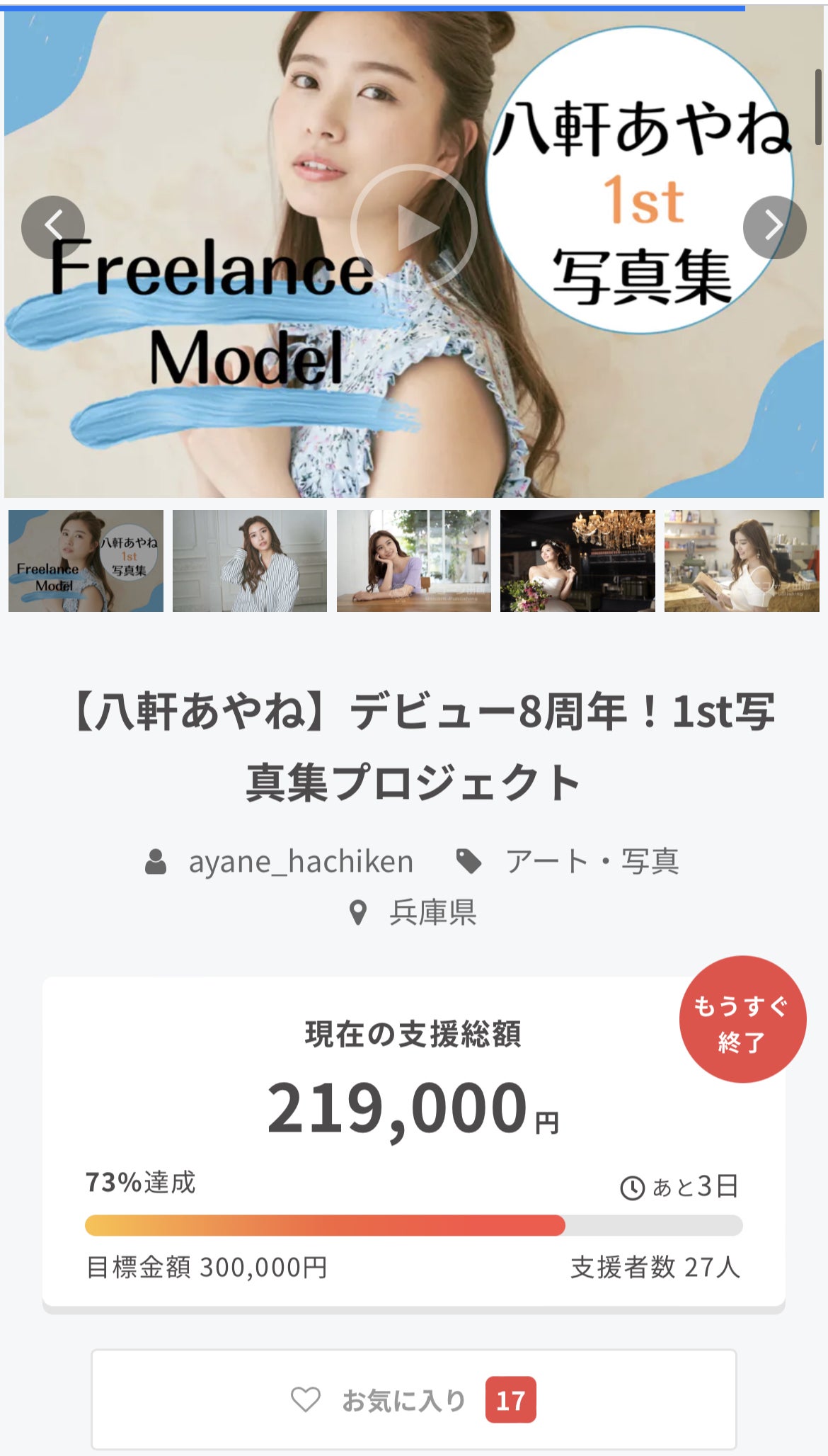 9/10クラウドファンディング終了皆様こんにちは(^^)昨日23:59で『八軒あやねデビュー8周年1st写真集クラウドファンディング』終了しました!!!そしてなんと...目標112%達成!!!支援者数40人 339,000円という最高のフィニッシュになりました(((o(*゚▽゚*)o)))♡始めの頃はなかなか伸びず悩むこともありましたが、あやね応援団の皆様が周りの大切な方に紹介してくださったり、初めましての方が応援してくださったり、最後にいっきに達成となりました!!ご支援いただきました皆様、拡散してくださった皆様、本当にありがとうございました。心より感謝致します╰(*´︶`*)╯♡これから制作に入り、それぞれのリターンを皆様のもとへお届けさせていただきます(*´-`)また、出版記念パーティーは10/26(水)18:00〜20:00大阪梅田です。リターン選択いただいた皆様には改めてこちらからメッセージさせていただきます!!写真集完成のお知らせなど、活動報告もしばらく更新していきたいと思っておりますので、楽しみにお待ちくださいませ♡皆様、この度はあたたかいご支援、本当にありがとうございました!!引き続き八軒あやねを応援していただけると幸いです(●´ω`●)宜しくお願い致します。
