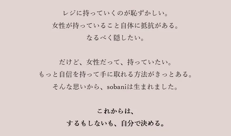 コンドーム に関し、フランクに会話できるカルチャーをつくっていきたいと言えど、突然「コンドーム 」と書かれた宅配便が届くのに抵抗を感じる方も多いと思います。sobaniのリターン発送時に品名を記載する際には「化粧品」と記載いたしますので、ご安心ください。sobaniはこれからも、皆様のそばに寄り添う存在でありたいと思っています。