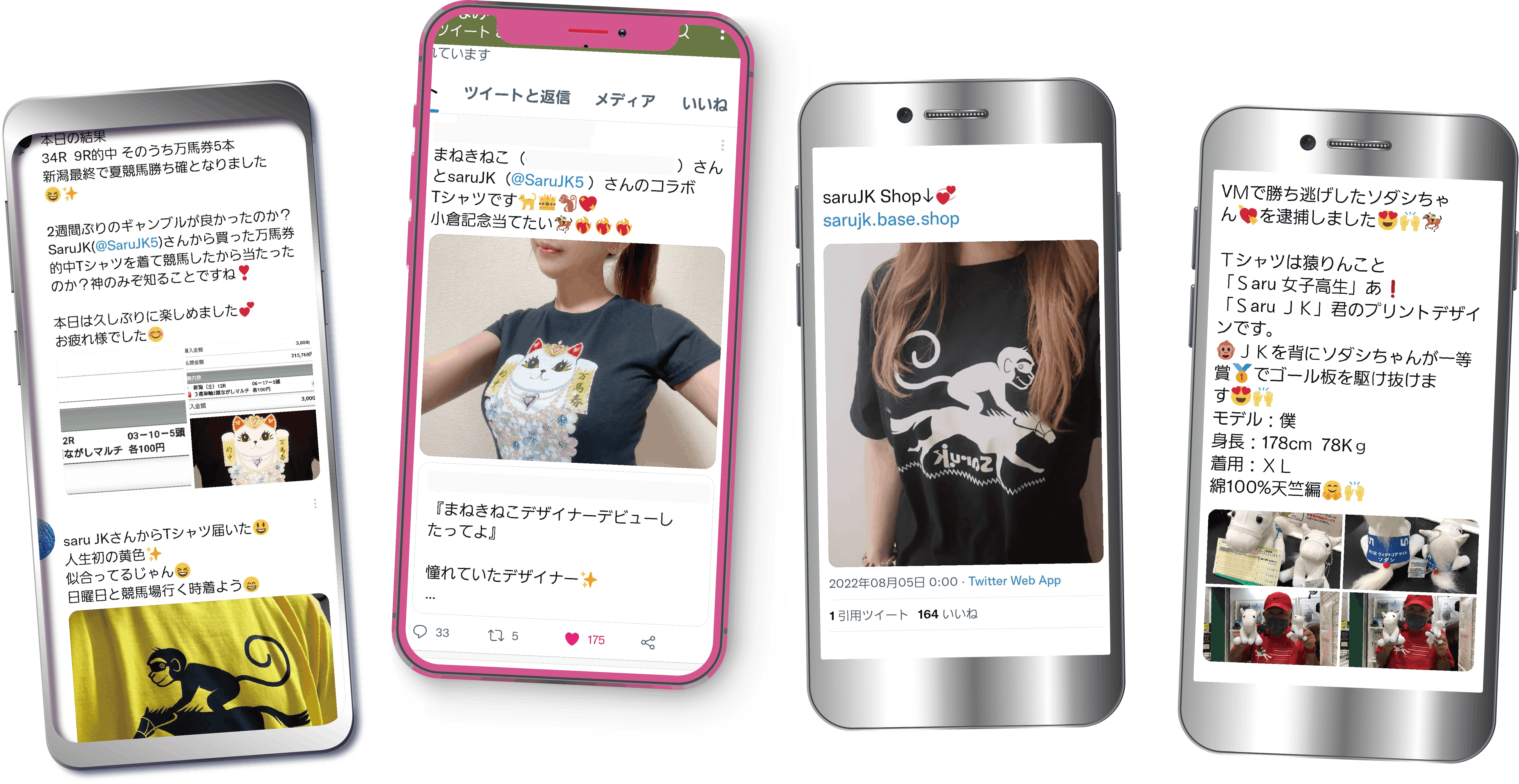 同時期にTwitterで沢山の競馬仲間と知り合う事が出来ました。そうした中で何か自分の能力を活かして競馬界に寄与出来る事はないかと思った事を可視化したのが今回のプロジェクトになります。今後、SaruJKショップの売上からも毎年寄付出来るよう、皆様に支持されるようなブランドに育てていきたいと思います。