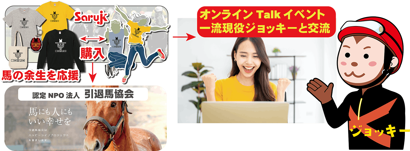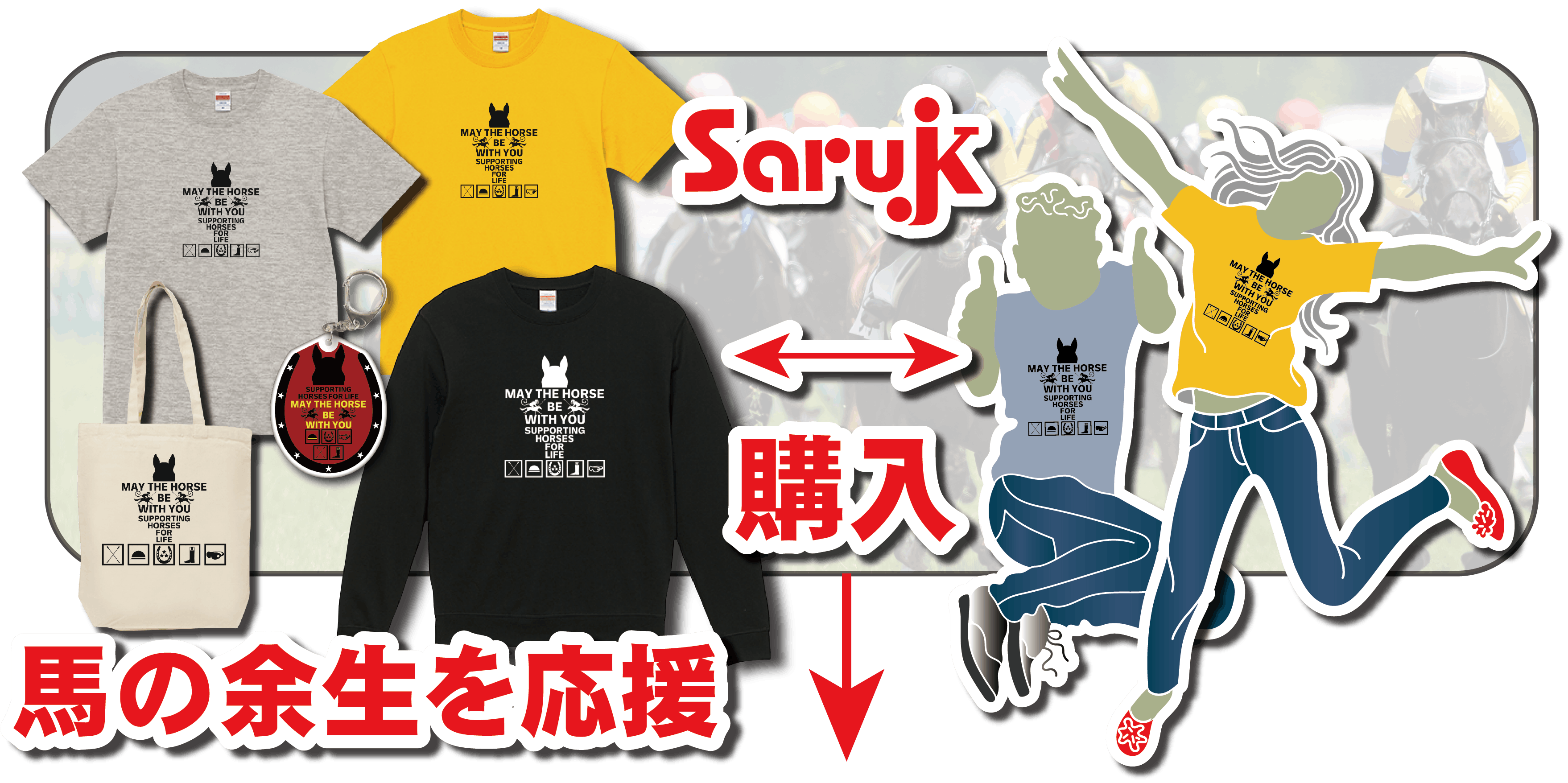 今後『 SaruJK アイテム 』の売上(消費税抜)の3%を競馬ファンの気持ちとして認定NPO法人引退馬協会 様に寄付させていただく活動をしていきたいと思います。