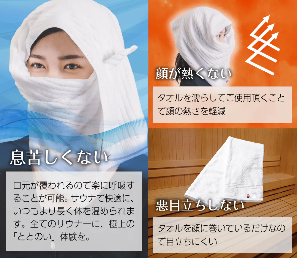 一番の特徴は口元が濡れたタオルで覆われるため熱波で苦しくなりにくく長くサウナに入っていられることです。