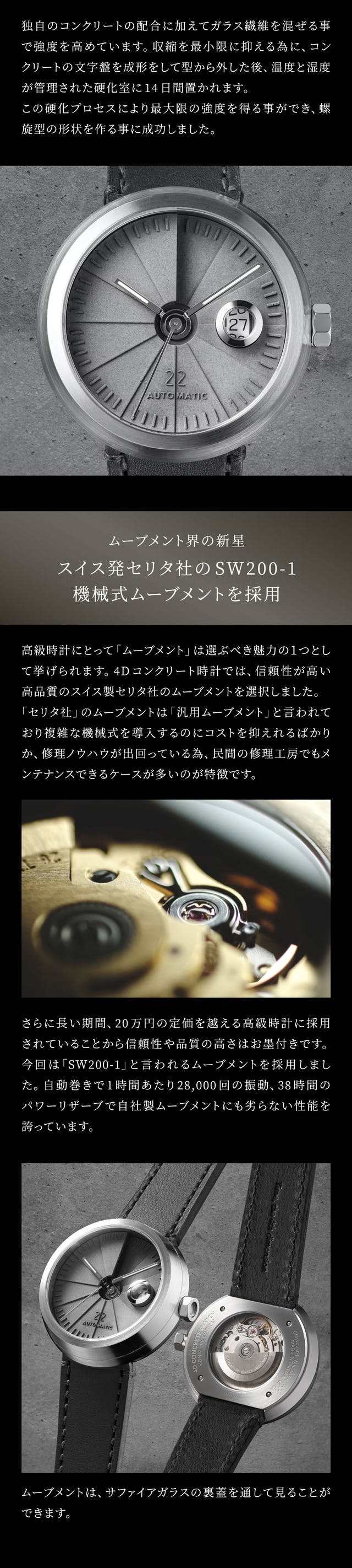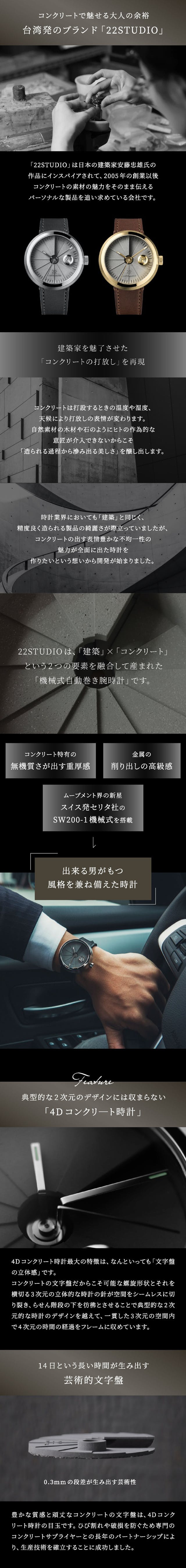 ミクロン単位の加工が求められることも珍しくなく、そこで培われた精密な機械加工技術を活かして出来た時計が22STUDIOの時計です。さらに時計には珍しいコンクリートの文字盤を採用しており他にはない出来る男の時計に仕上がっています。