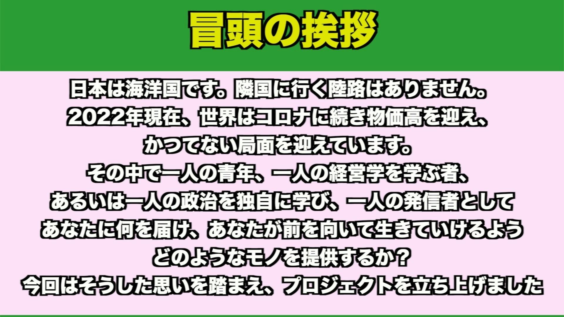 2022/12/06 17:00こんにちはYUKIMORIです。昨日、2人目のご支援を頂きました!(合計9500円)本当に心の底から感謝を申し上げます。「ありがとうございました!」9000円といったら、全国旅行支援まで行った「東京から伊豆までの伊豆踊り子号の価格」ですが、、、「大金すぎるんですよ・・・(笑)」←一時期、節約にハマった私の半月の食費です。だから「メールが届いた時に、あまりに驚きすぎて目が飛び出てしまいそうでした(笑)」マジで嬉しかったです!「改めまして、ご支援頂き本当にありがとうございます」そして、まだリターンを購入していない方! 地政学は大変価値のある学問で、海峡にまつわる知識は海洋国家で生きる私たちには不可欠です。「防衛費の増額のニュースや反撃能力の保有のニュース見ました?」それほど今、戦後かつてないほど緊迫した国際情勢で私たちは生きているんです。日本政府、反撃能力の保有へ YUKIMORIニュース↑よければこちらのインスタグラムを見てください!情報を短いかつ分かりやすくまとめるのが私の特技です。残り三日、最後までよろしくお願いします! もっと見る【祝】ご支援いただきましてありがとうございます!