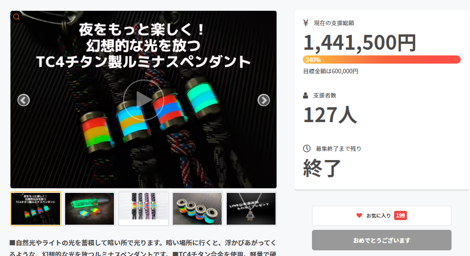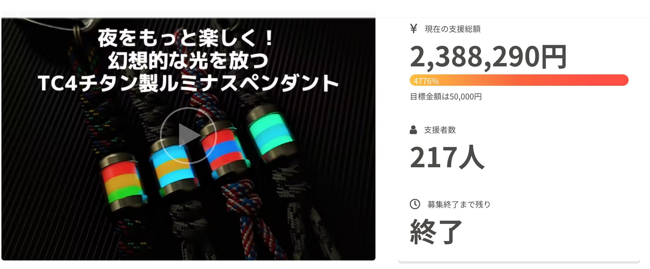 TC4チタン製ルミナスペンダントは、これまでたくさんのご支援いただき、誠にありがとうございました!実店舗の出店にも目指しているので、引き続きよろしくお願いいたします。